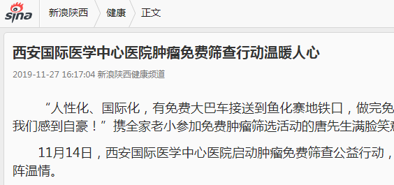 新浪網報道—西安國際醫(yī)學中心醫(yī)院腫瘤免費篩查行動溫暖人心。點擊閱讀。