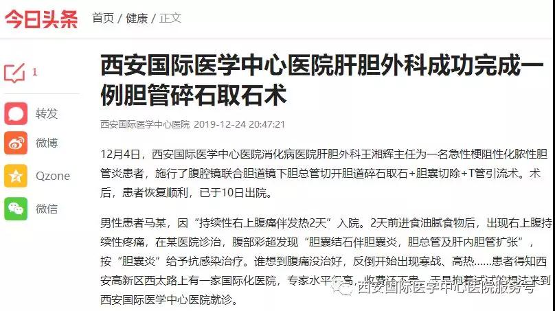 12月4日,西安國(guó)際醫(yī)學(xué)中心醫(yī)院消化病醫(yī)院肝膽外科王湘輝主任為一名急性梗阻性化膿性膽管炎患者,施行了腹腔鏡聯(lián)合膽道鏡下膽總管切開膽道碎石取石 膽囊切除 T管引流術(shù)。術(shù)后,患者恢復(fù)良好,于10日出院。