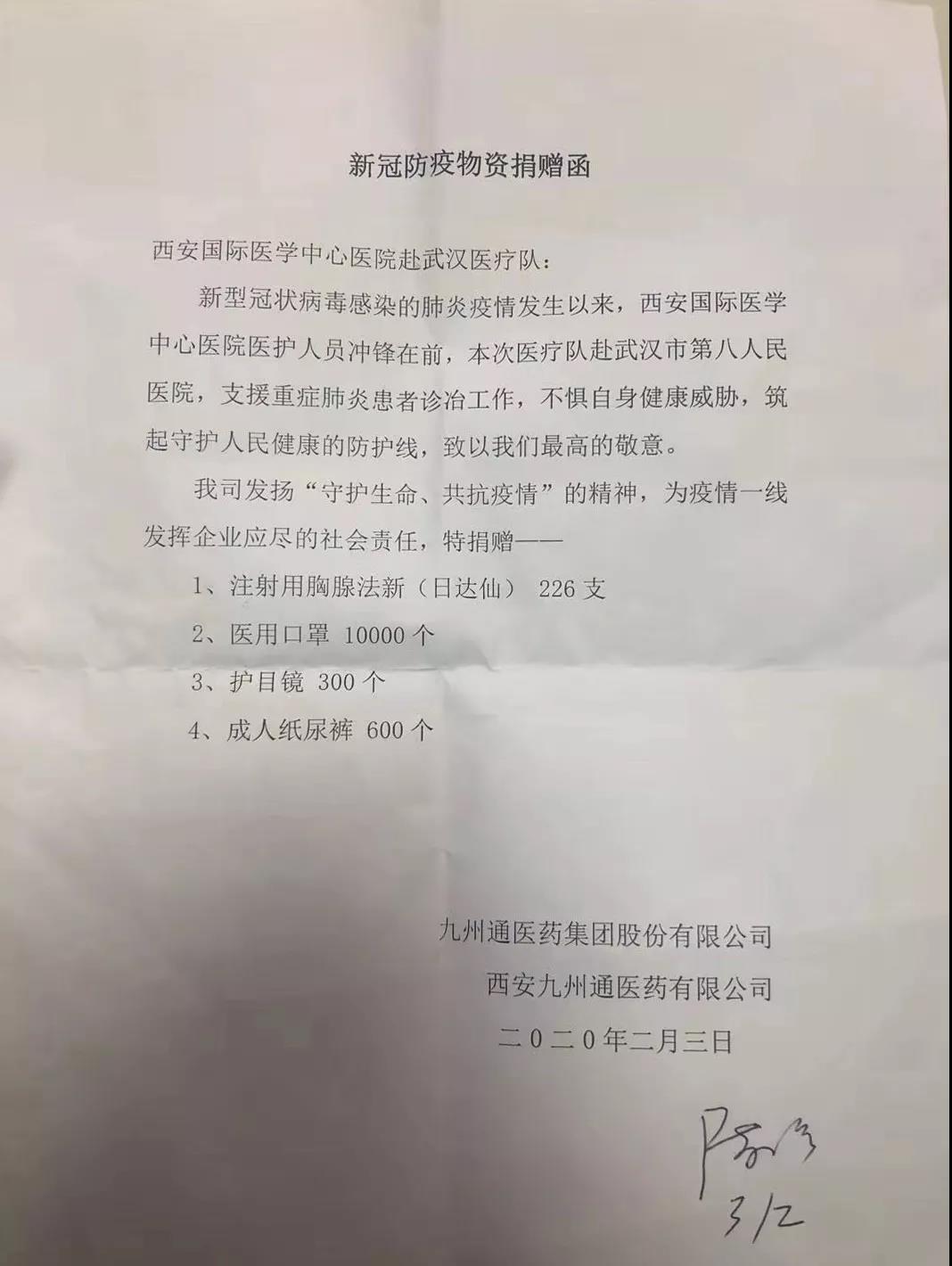 2月3日,九州通醫(yī)藥集團股份有限公司、西安九州通醫(yī)藥有限公司捐贈:注射用胸腺法新(日達仙)226支、醫(yī)用口罩10000個、護目鏡300個、成人紙尿褲600個。
