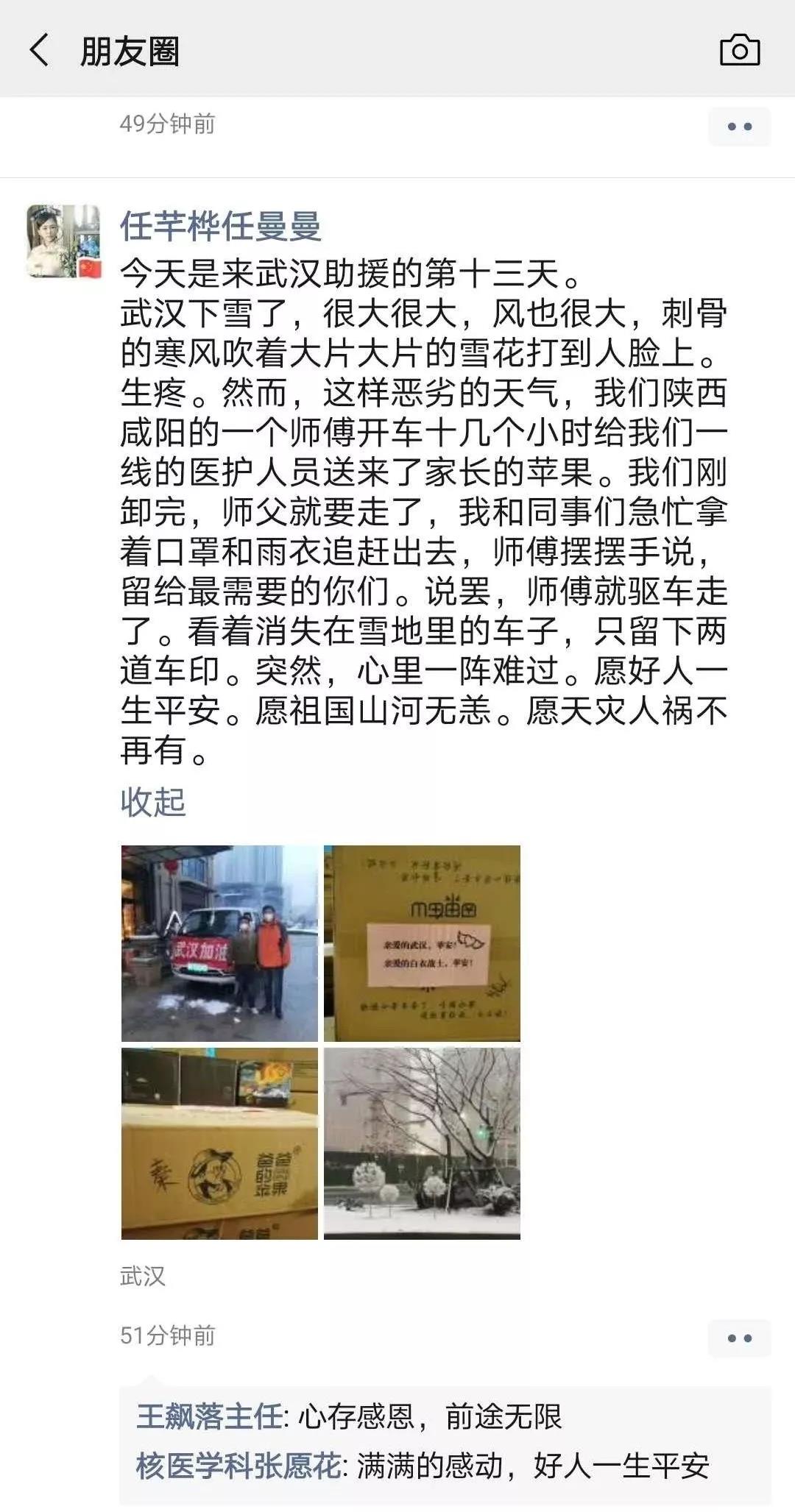 任曼曼久久不能平靜,在朋友圈里寫到:今天是來武漢援助的第十三天。武漢下雪了,很大很大,風(fēng)也很大,刺骨的寒風(fēng)吹著大片大片的雪花打到人臉上,生疼。然而,這樣惡劣的天氣,我們陜西咸陽的一個師傅開車十幾小時給我們一線的醫(yī)護人員送來了家鄉(xiāng)的蘋果。我們剛卸完,師傅就要走了,我和同事們急忙拿著口罩和雨衣追趕出去,師傅擺擺手說給最需要的你們。說罷,師傅就驅(qū)車走了??粗г谘┑乩锏能囎樱涣粝聝傻儡囉?。突然,心里一陣難過。愿好人一生平安,愿祖國山河無恙,愿天災(zāi)人禍不再有!