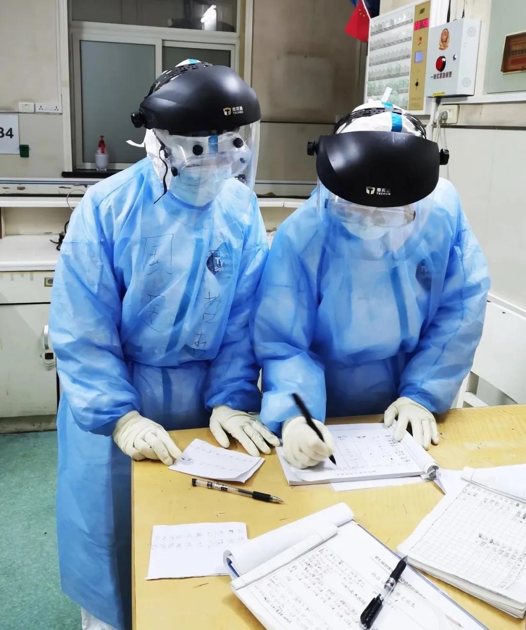 在抗“疫”工作中,她們一邊用精湛的護(hù)理操作技術(shù)為患者減輕病痛的折磨,一邊用溫暖貼心的話語(yǔ)增加患者戰(zhàn)勝疾病的信心。穿著厚重的防護(hù)服、隔離衣,戴著護(hù)目鏡、面屏、3層手套為患者穿刺留置針,取咽拭子標(biāo)本,抽取血標(biāo)本,氧氣吸入,口服藥發(fā)放,醫(yī)囑的處理,床單元的消毒……這就是她們繁忙的日常工作。