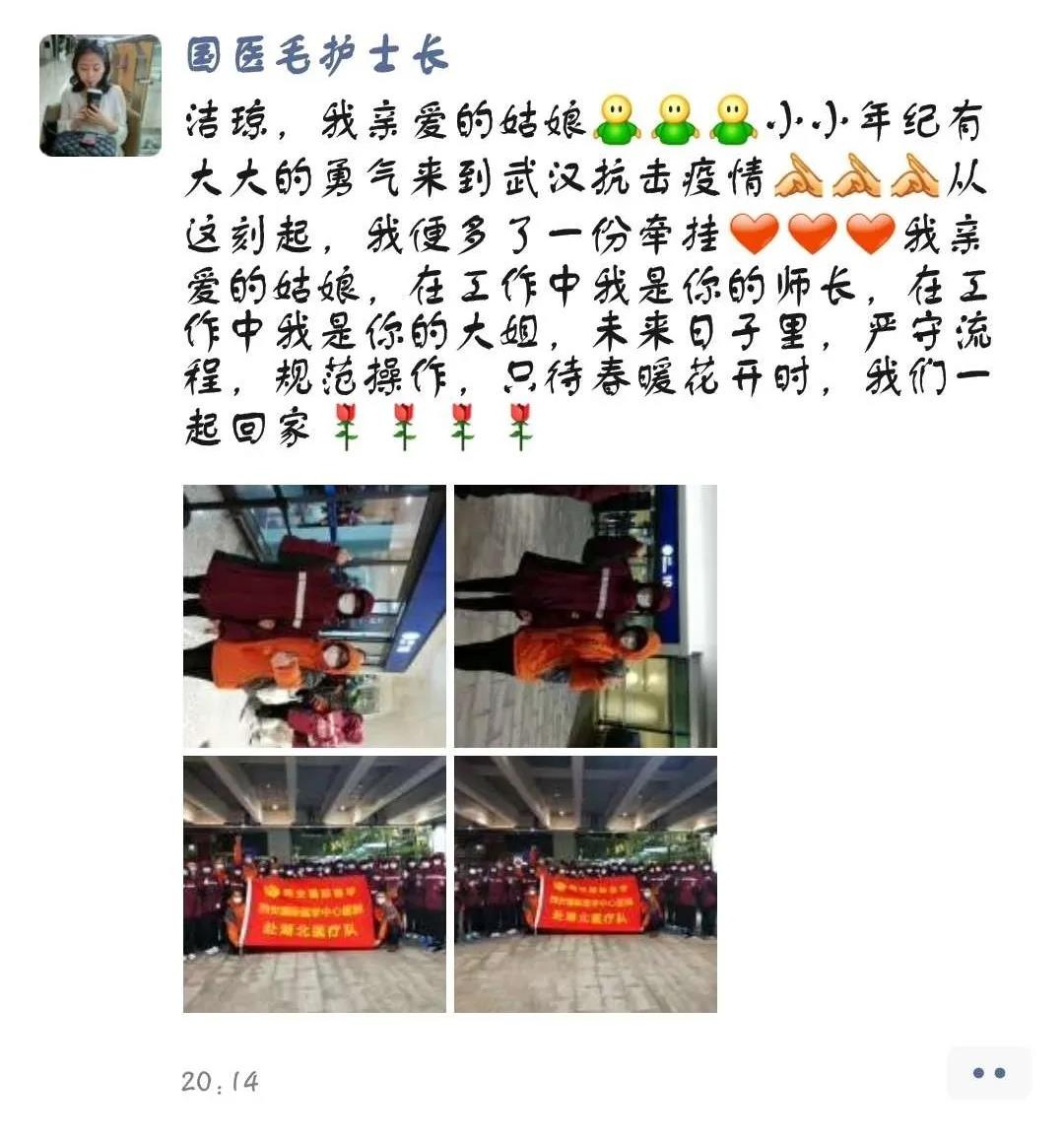 “潔瓊,我親愛的姑娘,小小年紀(jì)有大大的勇氣來到武漢,抗擊疫情,從這刻起,我便多了一份牽掛,我親愛的姑娘,在工作中我是你的師長,在生活中我是你的大姐姐,未來日子里,嚴(yán)守流程,規(guī)范操作,只待春暖花開時(shí),我們一起回家?!边@些話中充滿了護(hù)士長對潔瓊的鼓勵(lì)、疼惜、牽掛以及對抗擊疫情必勝的信心,我親愛的戰(zhàn)士們,加油,我們與你同在。