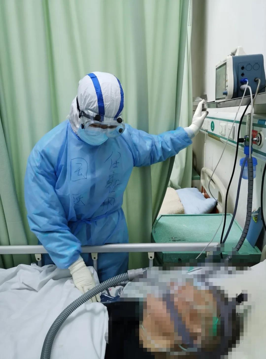 凌晨1點多,一位84歲的老人,確診為陽性,無尿,四肢冰冷,使用呼吸機。我們迅速補液,并用手套自制的暖水袋給予保暖,同時不停地喊著:“爺爺,爺爺,不能放棄,加油,我們陪在你的身邊,一起和病毒做斗爭!”他好像能聽得見我們說話,微微地動了一下頭,眼角濕潤了。