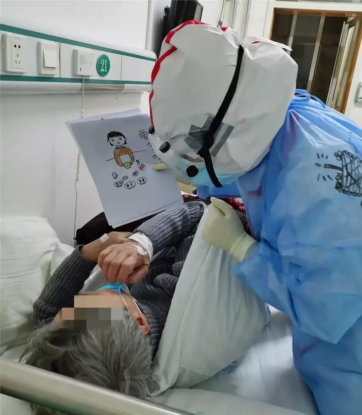 2月23日晚21:22,病區(qū)收治了一位從養(yǎng)老院送來(lái)的八十多歲的老奶奶,社區(qū)負(fù)責(zé)人把奶奶送到醫(yī)院后匆匆離院。疫情緊急,來(lái)時(shí)匆忙,奶奶入院后沒(méi)有帶一件生活用品??诳氏牒人荒苡貌》坷锏乃畨厣w將就,夜晚睡覺(jué)奶奶佩戴的假牙也只能泡在水壺蓋里。這一幕,被夜間值班的95后護(hù)士車(chē)敏鑫巡視病房時(shí)看在了眼里,她親切地詢(xún)問(wèn)奶奶是否需要幫助,準(zhǔn)備生活用品。但因奶奶方言口音較重、聽(tīng)覺(jué)不靈、又不識(shí)字,造成語(yǔ)言交流障礙。