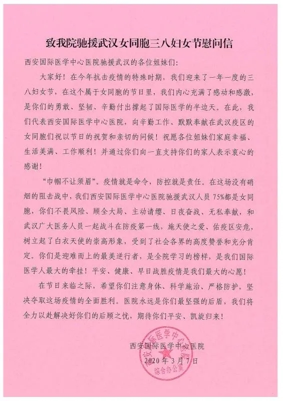 “疫”線有我,做“逆行先鋒”。疫情發(fā)生正值春節(jié)假期,西安國際醫(yī)學(xué)中心醫(yī)院從全面部署防控工作到建立聯(lián)防聯(lián)控工作機制,從醫(yī)療隊員火速馳援到醫(yī)療物資緊急保障,從正式進駐武漢第八醫(yī)院和隨州市中心醫(yī)院到全面接收新冠患者……都有女隊員們不懼危險、日夜奮戰(zhàn),同時間賽跑,與病魔較量的身影。2月2日,接陜西省衛(wèi)健委馳援武漢的指令,5個小時,1000余名女醫(yī)護人員主動請纓,遞交了請戰(zhàn)書、紅手印。腫瘤醫(yī)院副院長薛妍教授、感控部主任劉冰、總護士長倪曉慧等醫(yī)護人員舍小家、為大家,迅速出擊、臨危不懼,不計名利、不顧生死,于2月3日搭乘包機到達指定地點,令人肅然起敬,令人敬佩感動。
