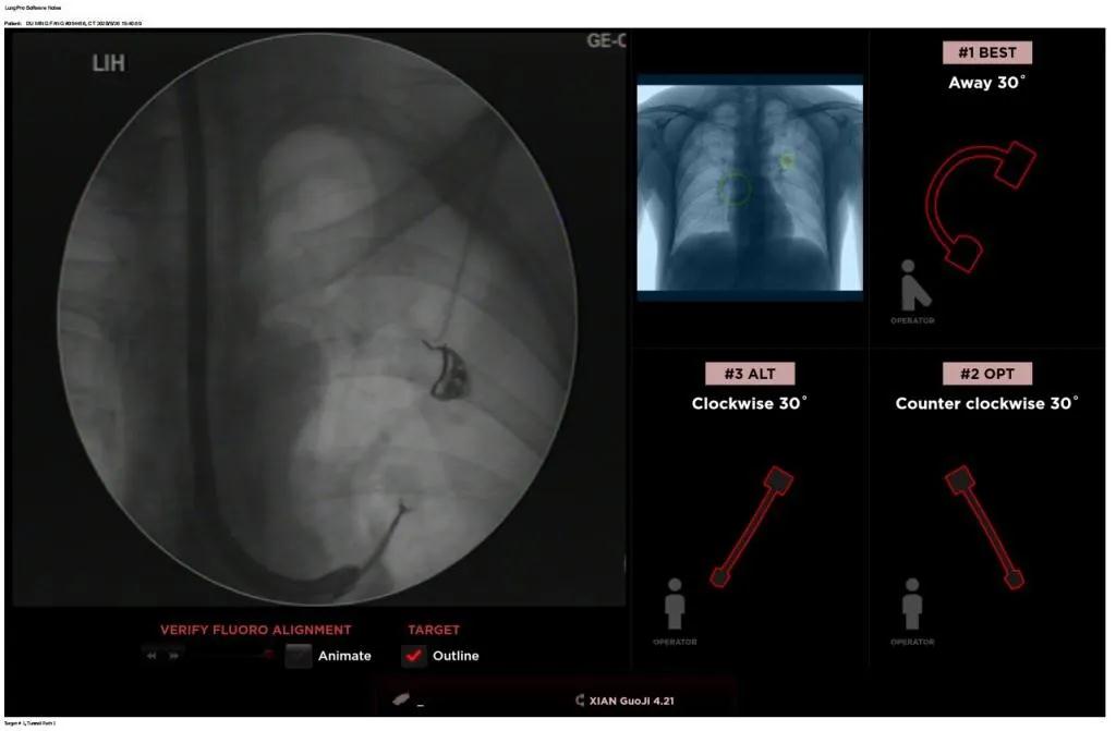 經(jīng)過充分的討論后,歐陽海峰副院長決定為患者實(shí)施LungPro全肺導(dǎo)航系統(tǒng)引導(dǎo)的經(jīng)支氣管跨肺實(shí)質(zhì)肺外周結(jié)節(jié)活檢術(shù)。Broncus導(dǎo)航系統(tǒng)LungPro具有全球領(lǐng)先獨(dú)創(chuàng)的BTPNA技術(shù)(支氣管鏡下跨結(jié)節(jié)抵達(dá)術(shù)),可以實(shí)現(xiàn)對(duì)氣道外周孤立性肺小結(jié)節(jié)的精準(zhǔn)定位,建立直接通往氣道外病變部位的通道,以實(shí)現(xiàn)全肺的診斷及后續(xù)治療。這項(xiàng)技術(shù)不僅彌補(bǔ)了現(xiàn)有支氣管鏡技術(shù)由于受限于病變部位是否有氣道可通向以及無法準(zhǔn)確定位病變部位而造成的較低診斷率,同時(shí)還彌補(bǔ)了CT引導(dǎo)下經(jīng)胸穿刺(TTNA)無法適用于某些特定部位如中央及肩胛骨等結(jié)節(jié)的問題,并且還避免了經(jīng)胸穿刺給患者帶來氣胸、出血的高風(fēng)險(xiǎn),可有效提高肺部結(jié)節(jié)及早期肺癌診斷陽性率,亦可用于早期肺癌的射頻消融或微波治療,具有微創(chuàng)、安全、同期雙肺診療等優(yōu)勢(shì)。