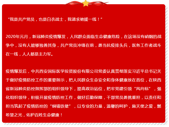 疫情發(fā)生后,西安國際醫(yī)學很多黨員主動請纓,踴躍報名參加馳援武漢醫(yī)療隊。