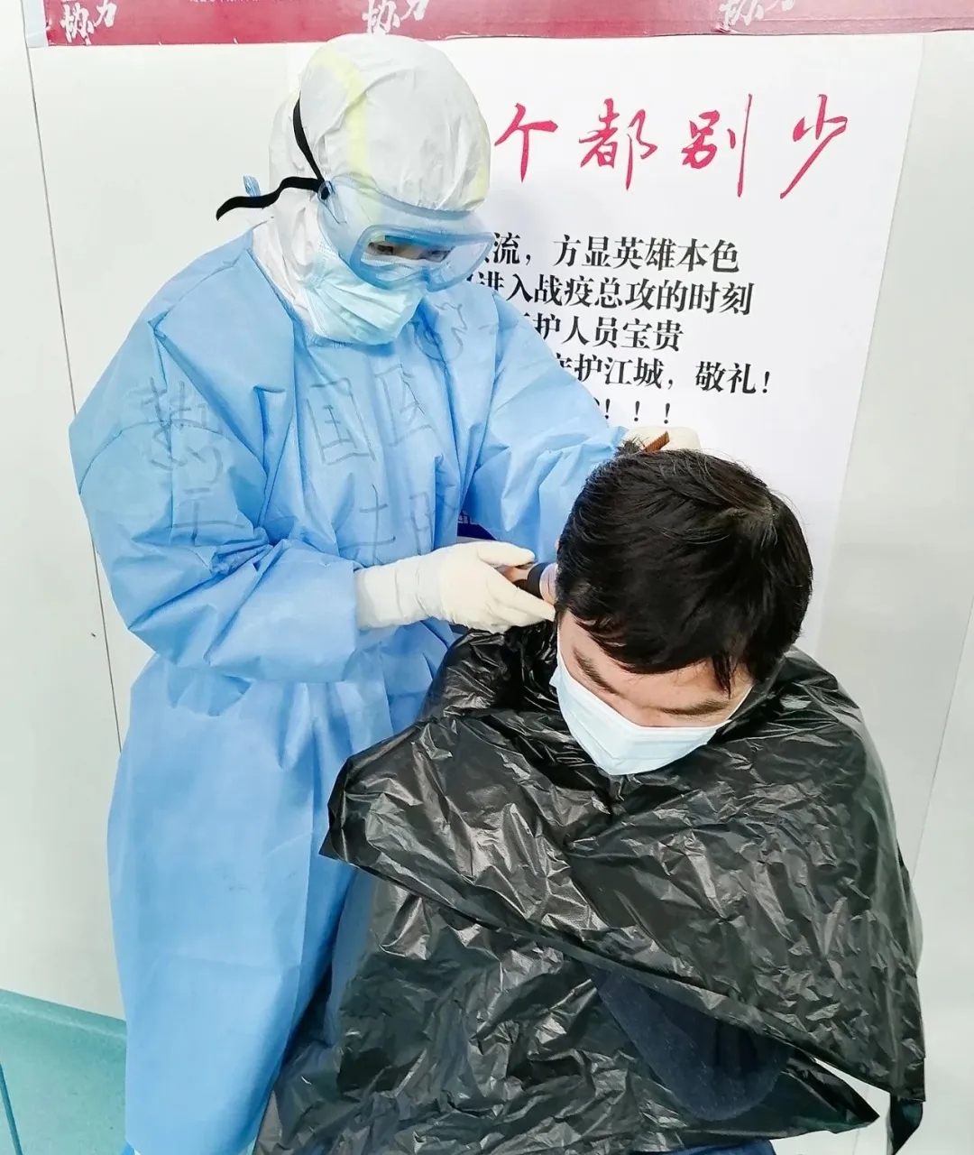 1艙有康復(fù)人員想理發(fā),手頭沒有工具,朱晴護士長得知后,聯(lián)系下個班次護士帶來推子,給大家理發(fā)?!翱茨銊幼骱軏故彀?,以前練過的吧”,“圍觀群眾”打趣道?!艾F(xiàn)學(xué)現(xiàn)賣,大家要求不要太高,有壓力??!”朱晴說。一直推到推子沒電,朱晴給6位康復(fù)人員簡單修剪了頭發(fā)。得知朱晴是西安醫(yī)療隊的護士,大家都親切的稱她“肉夾饃”!