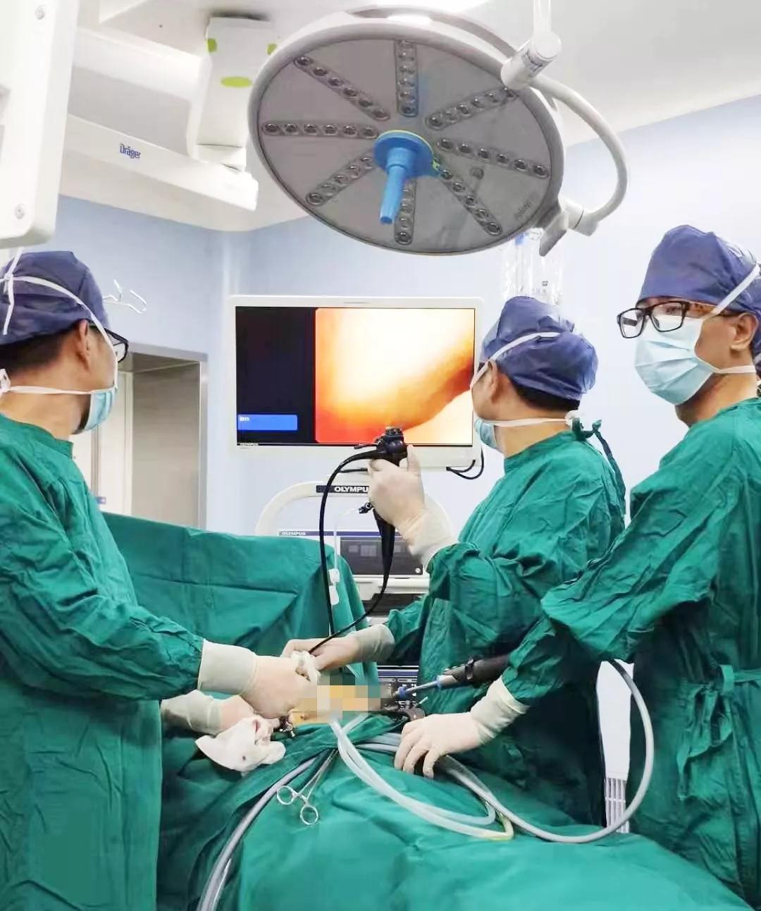 排除手術(shù)禁忌后,王湘輝主任親自主刀,為患者在全麻下行腹腔鏡聯(lián)合膽道鏡下膽總管切開膽道碎石取石 膽囊切除 T管引流術(shù)。手術(shù)中發(fā)現(xiàn)膽囊腫的比茄子還大,周圍組織脆的一碰就流血,膽總管明顯擴(kuò)張(1.5cm),切開膽管后見乳白色膿性膽汁溢出,膽道鏡下見膽管內(nèi)壁充血水腫,膽總管下段緊緊卡著一枚指甲蓋大的金黃色結(jié)石,手術(shù)難度很大。王湘輝主任用膽道液電碎石儀打碎結(jié)石再用膽道鏡一塊塊取凈,用精湛的手術(shù)技巧疏通膽道。之后在腹腔鏡下順利切除重度炎癥的膽囊,用近三小時(shí)圓滿完成手術(shù)。術(shù)后第二天病人就能下床活動(dòng)正常吃飯了,到第6天就順利出院了。