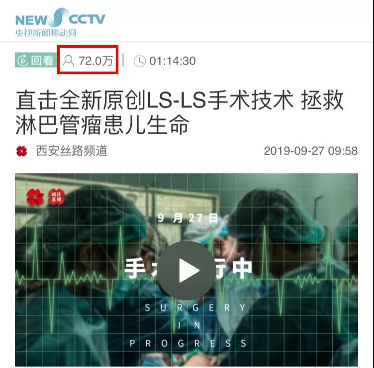 開診后的第一個手術日,西安電視臺全程直播了全新原創(chuàng)LS-LS手術技術拯救淋巴管瘤患兒生命的手術過程!央視新聞移動網(wǎng)、今日頭條客戶端、廣東廣播電視臺觸電新聞、西安網(wǎng)微博等同步播出西安國際醫(yī)學中心骨科醫(yī)院拯救淋巴管瘤患兒的全過程。據(jù)不完全統(tǒng)計,在線觀看直播達百萬,僅央視新聞移動網(wǎng)的觀看量達72萬!