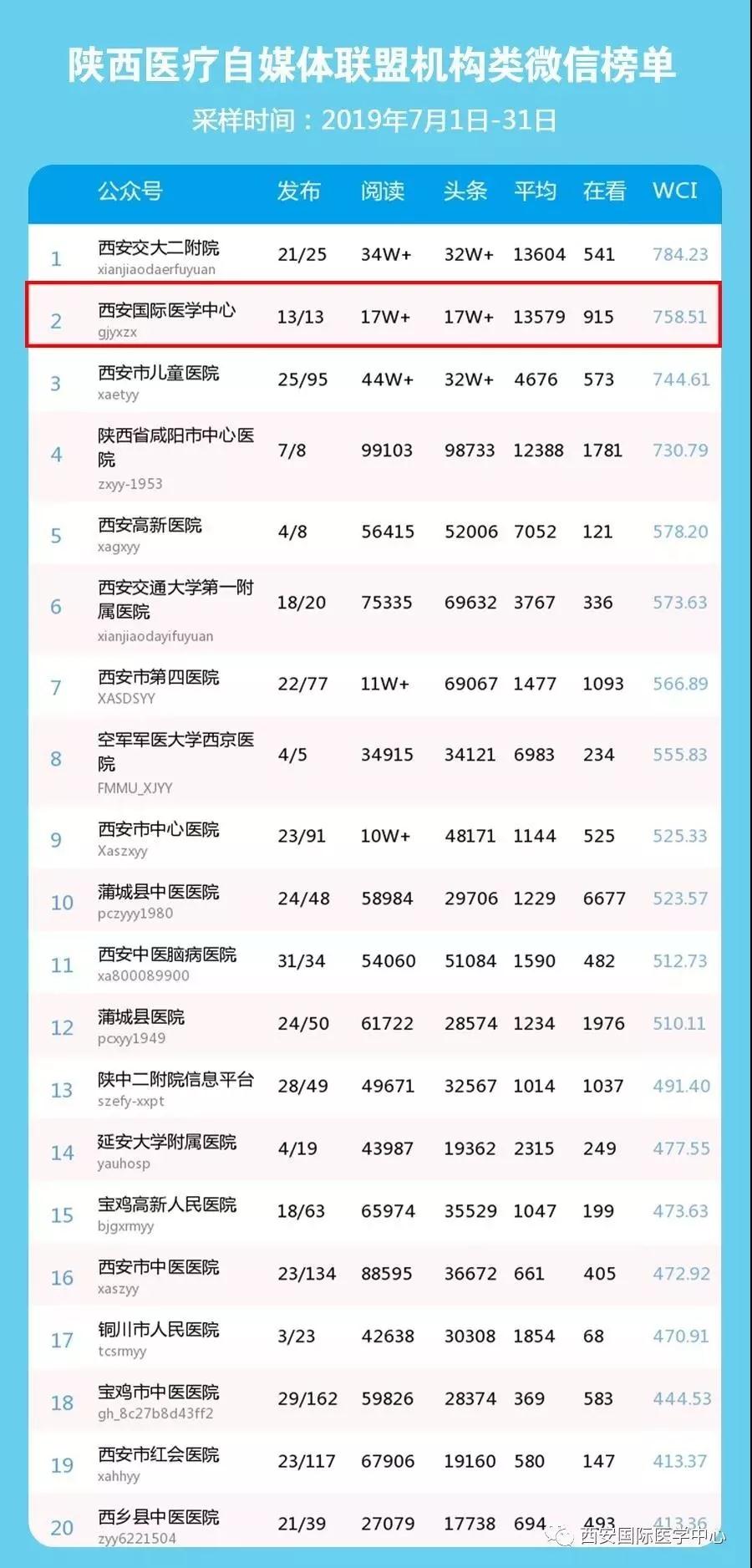 陜西醫(yī)療自媒體聯(lián)盟7月份機構類微信榜單