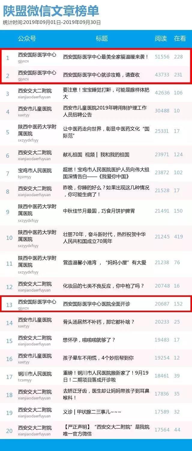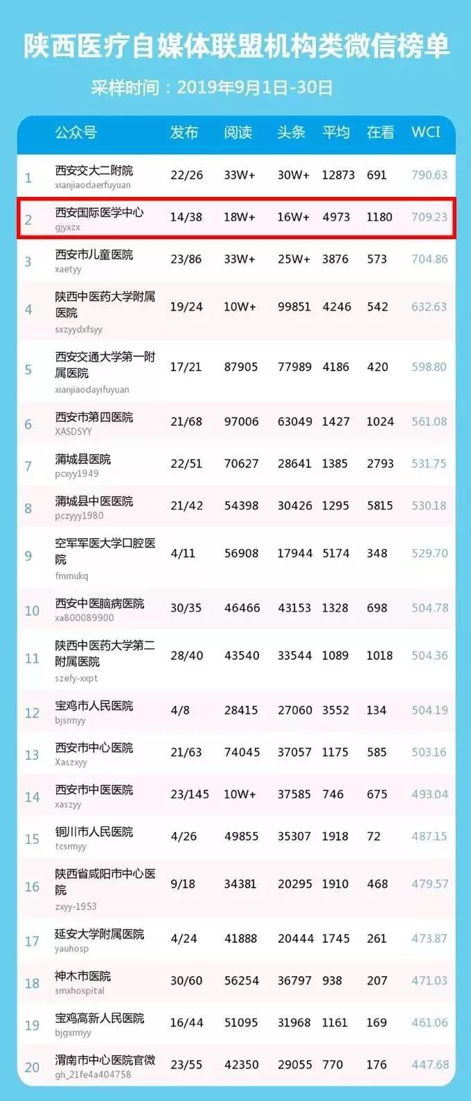 陜西醫(yī)療自媒體聯(lián)盟9月份機構類微信榜單
