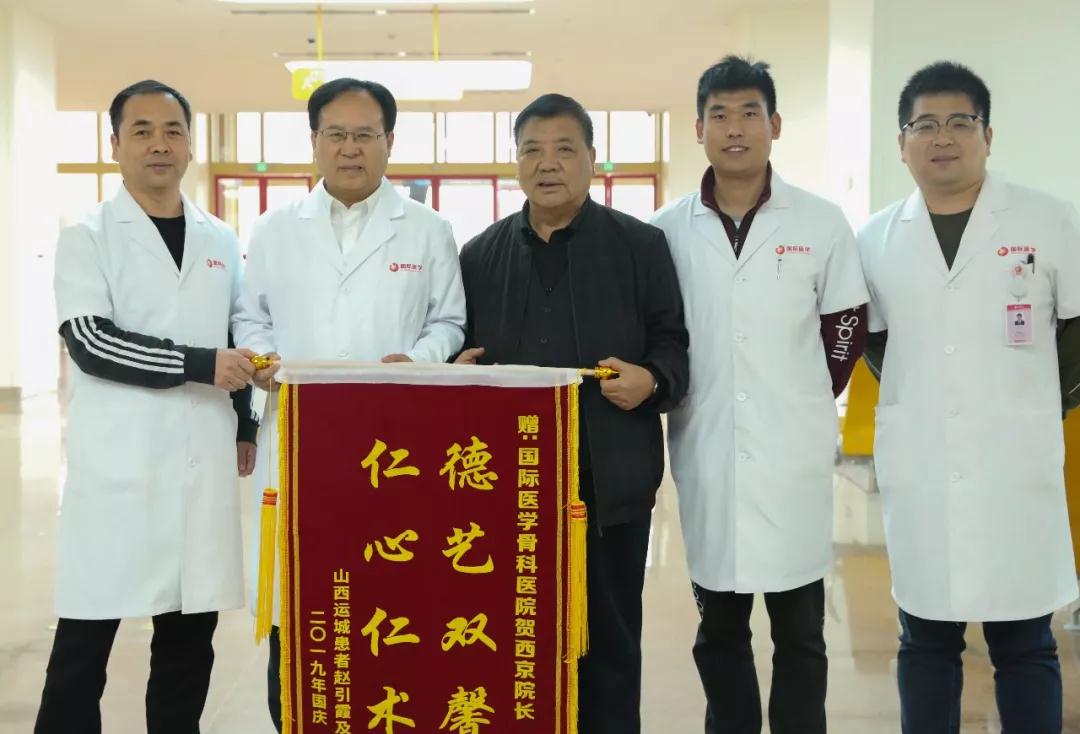 10月9號(hào)下午兩點(diǎn)半,患者家屬專程來(lái)到骨科醫(yī)院向賀西京院長(zhǎng)贈(zèng)送錦旗以示感謝。所有參與手術(shù)的醫(yī)護(hù)工作者都非常欣慰,并表示會(huì)再接再厲,珍惜每一次服務(wù),一次做好。