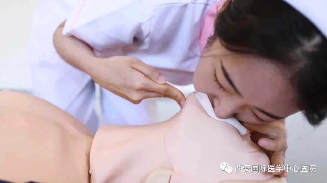 定位:雙乳頭連線的中點(diǎn),按壓的頻率一般是100--120次/分,按壓深度是5--6cm,胸外按壓30次后,頭偏向一側(cè)清除口腔分泌物,取出義齒,開(kāi)放氣道:無(wú)頸椎損傷采取仰額抬頜法,如頸椎有損傷,采取抬舉下頜法暢通氣道。吹氣2次(注意:每口吹氣時(shí)捏鼻),每次吹氣時(shí)間1秒,量400-600ml,吹氣后松開(kāi)鼻翼,看胸廓起伏。