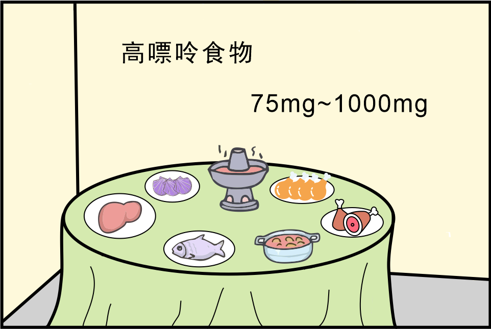 飲食控制:低嘌呤飲食,避免黨食用動物肝臟和腎臟等內臟、貝類、牡蠣和龍蝦等帶甲殼的海產品及濃肉湯和肉汁等。