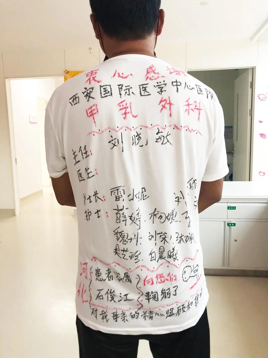 出院前一天,患者家屬想用一種特殊的方式記住醫(yī)生的恩情:“很感謝你們對(duì)我母親的照顧,你們?cè)谖疫@件襯衫上簽名,我開(kāi)車(chē)?yán)浀臅r(shí)候就穿這件衣服,我走到哪里就念著你們到哪里,宣傳到哪里!我想讓更多人知道西安國(guó)際醫(yī)學(xué)中心這家醫(yī)院!這家醫(yī)院不僅就醫(yī)環(huán)境好,醫(yī)護(hù)人員的服務(wù)態(tài)度也很棒,我在這里就醫(yī),讓我感覺(jué)到前所未有的溫暖,我想讓那些同樣飽受病痛折磨的人早日得到身心解放,他們也能感受到溫暖?!?