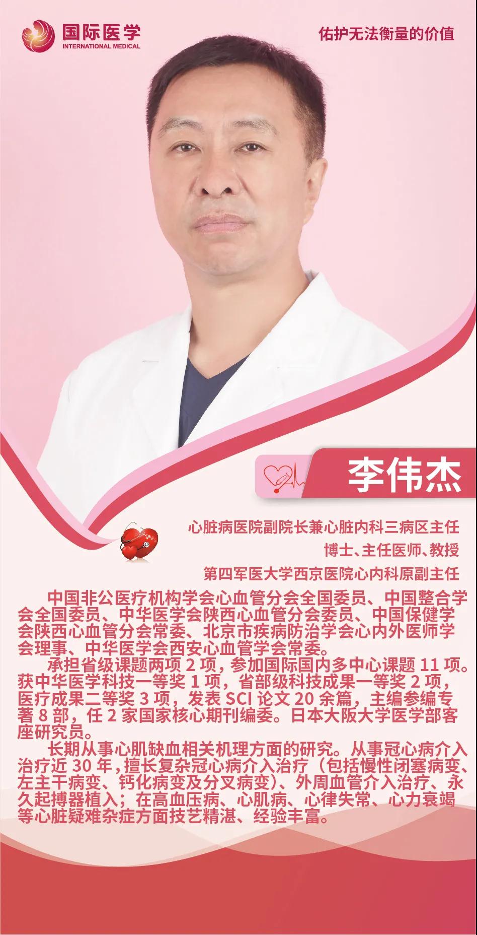 李偉杰,第四軍醫(yī)大學(xué)西京醫(yī)院心內(nèi)科原副主任,博士、主任醫(yī)師、教授。先后承擔(dān)了多項(xiàng)國際國內(nèi)及省部級課題,獲得過中華醫(yī)學(xué)科技一等獎等多重獎項(xiàng),長期從事于血管管介入治療,擅長冠心病復(fù)雜病變的介入手術(shù)治療,包括慢性閉塞病變、左主干病變、鈣化病變及分叉病變,在外周血管的介入治療級其他心血管疾病的診療方面具有非常豐富的經(jīng)驗(yàn)。李偉杰在西京醫(yī)院工作多年,掛號一票難求,因和藹可親的態(tài)度、精湛的醫(yī)技、崇厚的醫(yī)德獲得了一大批的患者“粉絲”,是患者口中的明星醫(yī)生,醫(yī)生口中的業(yè)界“男神”。