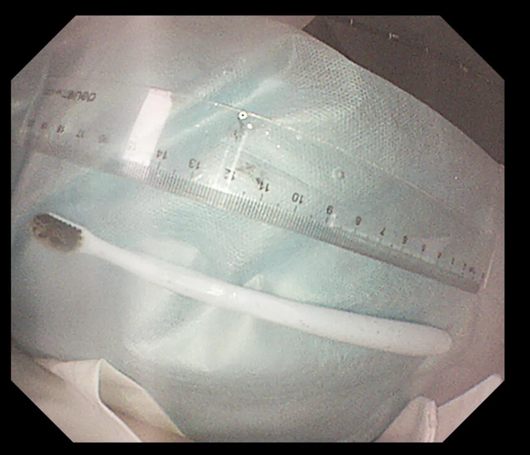 經(jīng)過反復(fù)努力嘗試,圈套器終于緊緊的套住異物,使牙刷長(zhǎng)軸盡量與食道長(zhǎng)軸平行,適當(dāng)注氣擴(kuò)張食道腔。經(jīng)過不懈努力,順利將其取出,取出牙刷經(jīng)測(cè)量長(zhǎng)度約20cm,似乎這條細(xì)細(xì)的胃鏡就是一條連接希望的生命線。此時(shí)在場(chǎng)所有人懸著的那顆心也終于落下。術(shù)后小楊癥狀逐漸消失,生命指征平穩(wěn),情緒也平靜下來。