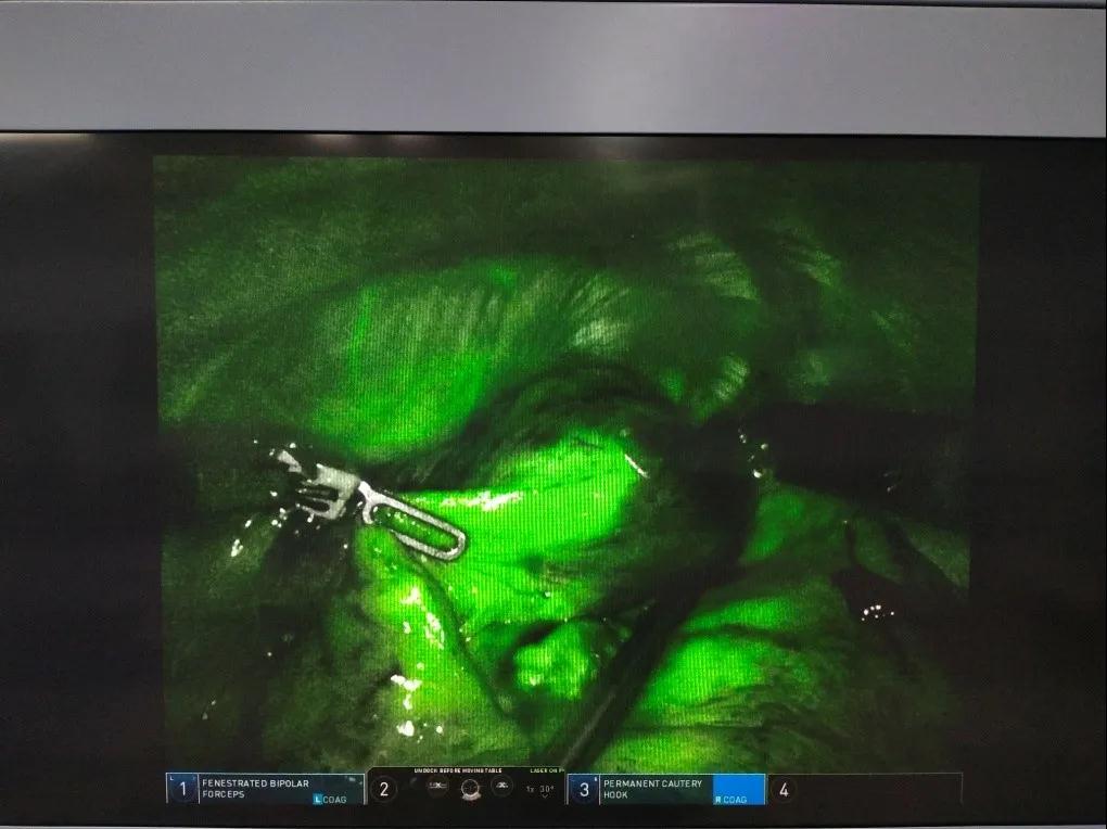 患者是一位老年女性,體檢發(fā)現(xiàn)左肺上葉尖后段結(jié)節(jié)半年,大小約1.6cm,近期復(fù)查較前明顯增大且實(shí)性成分增多。入院經(jīng)全面術(shù)前檢查與評(píng)估后,接受了第四代達(dá)芬奇Xi機(jī)器人輔助熒光染色左肺上葉尖后段切除 淋巴結(jié)清掃術(shù)。主刀醫(yī)師在病人胸部僅用3個(gè)0.8厘米的操作孔、1個(gè)約3厘米左右的輔助操作口,在胸腔置入機(jī)器人機(jī)械臂及3D胸腔鏡,將胸腔內(nèi)的組織結(jié)構(gòu)放大10-15倍。