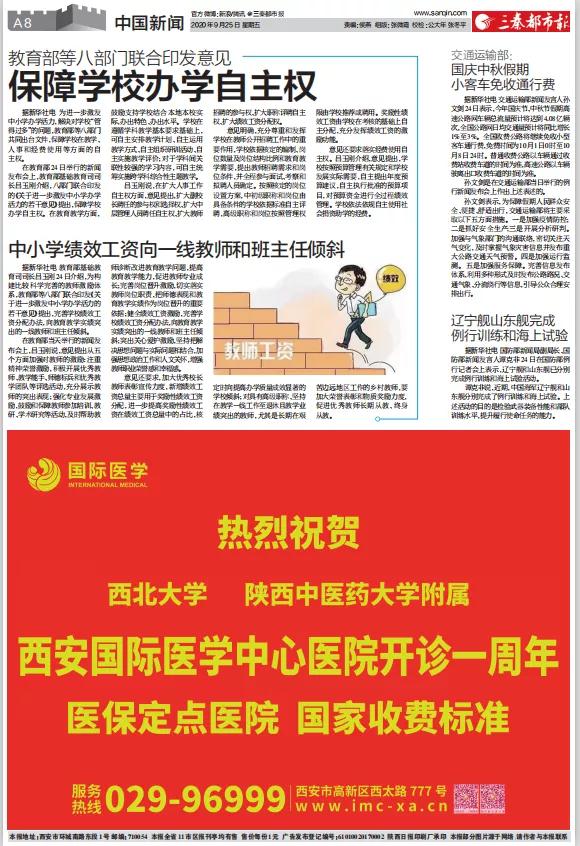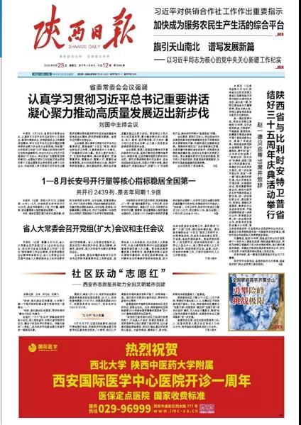 2020年9月25日,在西安國際醫(yī)學(xué)中心醫(yī)院一周歲生日之際,陜西日報(bào)、西安晚報(bào)、華商報(bào)、三秦都市報(bào)、陽光報(bào)分別刊文送上生日祝福。