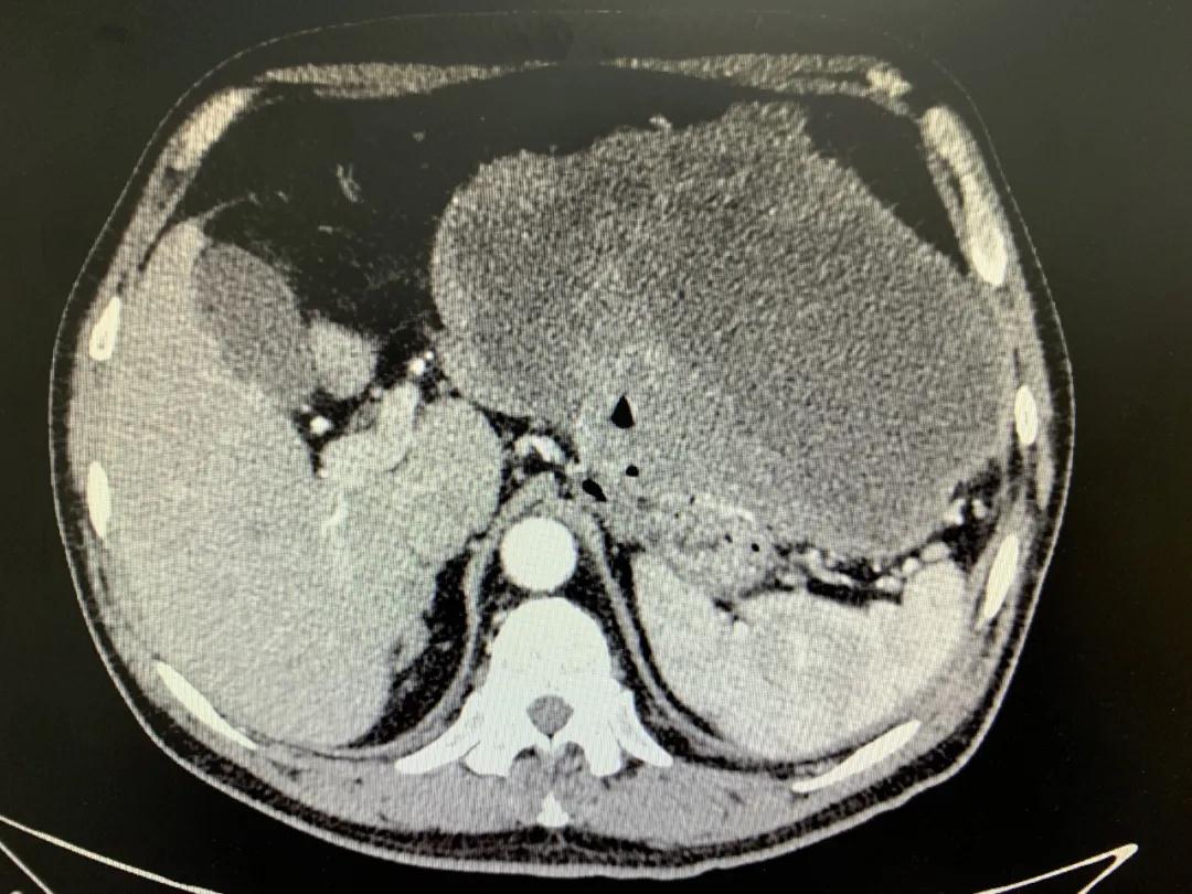 患者入院時(shí)血紅蛋白數(shù)值仍持續(xù)下降,出現(xiàn)失血性休克表現(xiàn),危及生命。消化外科二病區(qū)蔡磊主任接診后,組織科室迅速對(duì)患者進(jìn)行了全面的檢查。CT提示腫瘤大小約19.3*10.3cm,腫瘤內(nèi)提示大量積血。結(jié)合相關(guān)檢查,考慮為罕見(jiàn)的巨大胃間質(zhì)瘤合并出血。