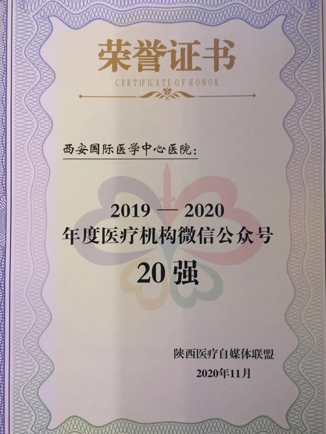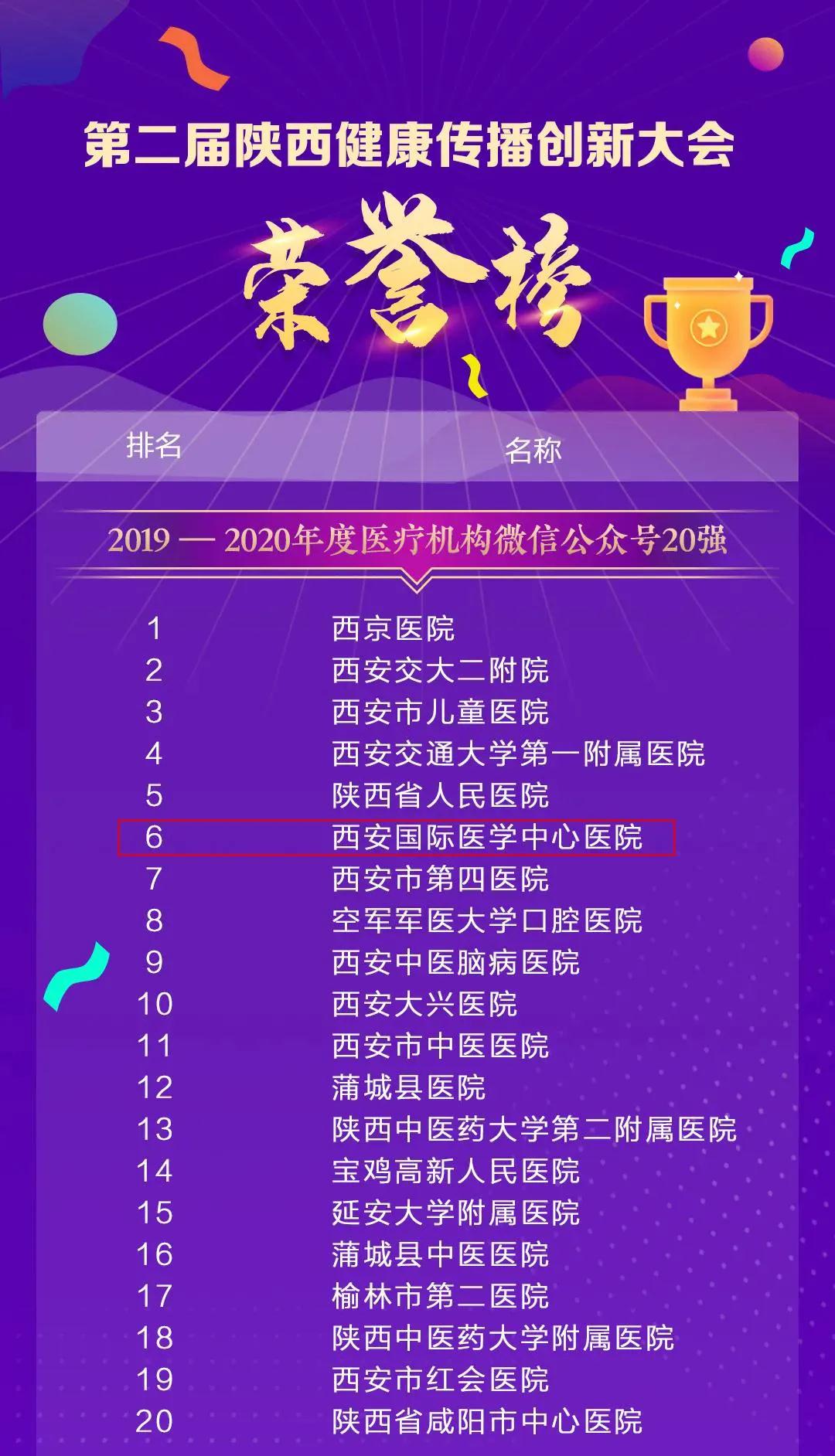 11月25日,由陜西省衛(wèi)生健康委員會、陜西省醫(yī)師協(xié)會指導,陜西醫(yī)療自媒體聯(lián)盟、陜西省衛(wèi)生健康干部培訓中心承辦的第二屆陜西健康傳播創(chuàng)新大會在西安召開。西安國際醫(yī)學中心醫(yī)院微信公眾號榮獲2020年陜盟醫(yī)療機構(gòu)微信公眾號第六名。