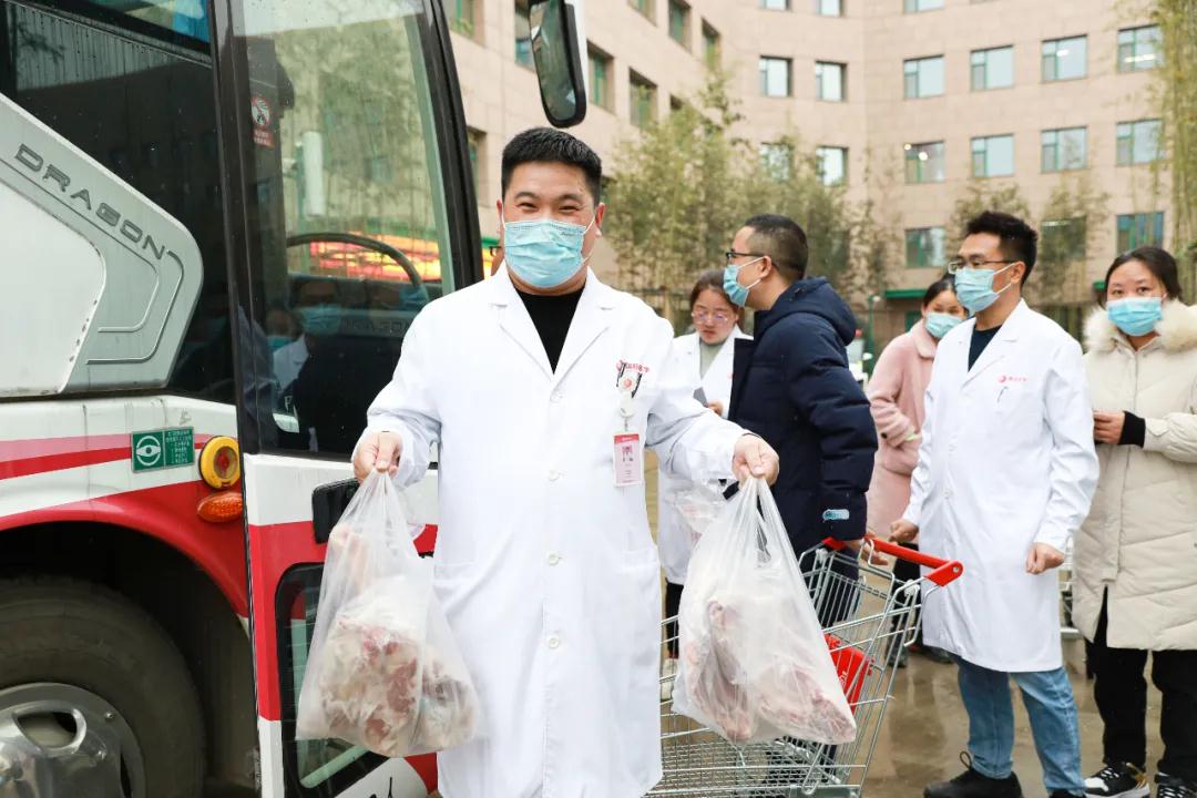 當(dāng)日上午,蒙古國(guó)捐贈(zèng)的486箱冷凍羊乘“接運(yùn)專車”到達(dá)陜西西安。按照國(guó)家統(tǒng)一部署,羊經(jīng)過嚴(yán)格檢驗(yàn)檢疫加工后轉(zhuǎn)運(yùn)陜西省,分配給前往湖北參與新冠肺炎疫情醫(yī)療救治工作的醫(yī)療隊(duì)員。我院收到100箱捐贈(zèng)羊。下午五點(diǎn),張良院長(zhǎng)助理帶領(lǐng)綜合辦公室工作人員,將一袋袋羊肉發(fā)到醫(yī)療隊(duì)隊(duì)員們手中。