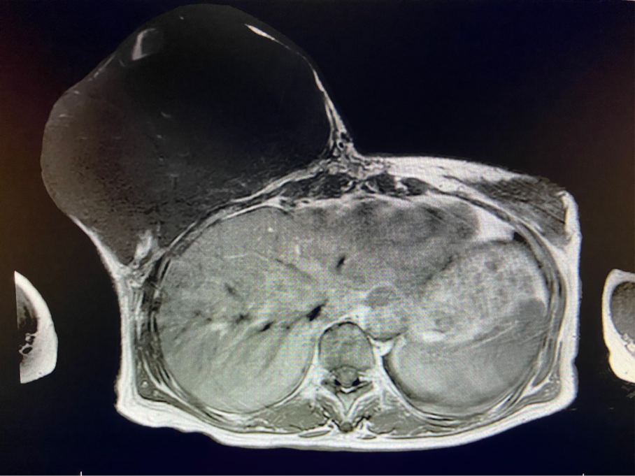 該患者右乳巨大腫物術(shù)前初步考慮乳腺葉狀腫瘤可能,因腫瘤太大,幾乎遍及整個(gè)右側(cè)乳房,為保證“無(wú)瘤原則”,術(shù)中切除范圍位置未知,極有可能出現(xiàn)皮瓣缺損。于是,經(jīng)過(guò)和整形醫(yī)院郭樹(shù)忠院長(zhǎng)、整形外科王愛(ài)武主任的討論,提供了兩種手術(shù)方式,一是創(chuàng)面修復(fù)(植皮或轉(zhuǎn)移皮瓣修復(fù)創(chuàng)面),二是乳房再造,與患者及家屬溝通后,決定先解決腫物,3年病情不再?gòu)?fù)發(fā)后,可以再考慮乳房重建。