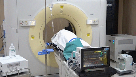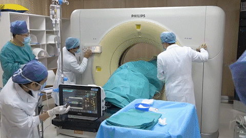 經(jīng)過放射治療中心陸軍主任的細致準備與精準定位,屈女士的射頻治療開始了。患者采取左側臥位,麻醉醫(yī)生立即進行靜脈全麻。在CT引導下,醫(yī)生手中的“消融針”,按照既定路線“穿引”,快速、準確地插入右肺病灶部位,啟動射頻機器進行了精準的消融,右肺局部癌細胞一下子就被超高溫成功滅活了!經(jīng)CT掃查,無血氣胸;患者生命體征平穩(wěn)。2個小時后,屈女士就下地活動了。