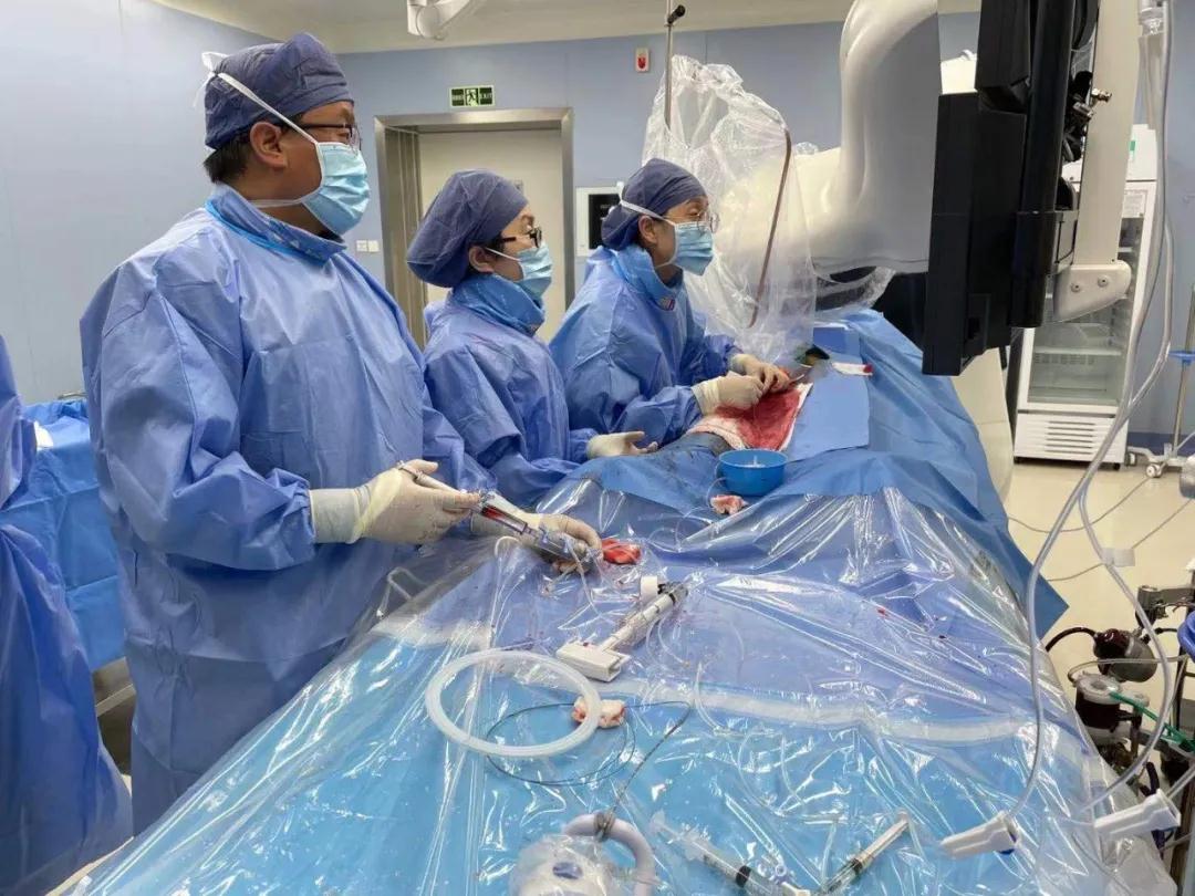 患者已有3枚支架,右冠狀動脈還是完全閉塞的狀態(tài),考慮到手術(shù)風(fēng)險極大,李偉杰建議在體外膜肺氧合技術(shù)(ECMO)輔助下行支架植入術(shù)。體外膜肺氧合技術(shù)是一種高端的人工心肺替代技術(shù),可以暫時代替患者的心臟和肺臟進(jìn)行做工,常用于各種危重癥患者。由于手術(shù)難度高,風(fēng)險大,李偉杰副院長帶領(lǐng)由衛(wèi)錦娟副主任醫(yī)師、郭艷杰副主任醫(yī)師、王長鷹主治醫(yī)師、孫闖主治醫(yī)師組成的心臟內(nèi)科三病區(qū)手術(shù)核心團(tuán)隊分工合作,在心臟外科二病區(qū)主任程亮團(tuán)隊的保駕護(hù)航下,手術(shù)最終順利完成,患者平穩(wěn)返回病房,家屬激動不已。第一位患者手術(shù)結(jié)束后,在李偉杰的帶領(lǐng)下,兩支團(tuán)隊又著手為另一位嚴(yán)重三支病變患者實施了ECMO輔助下支架植入術(shù),手術(shù)在團(tuán)隊密切配合下順利完成。