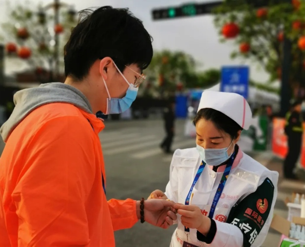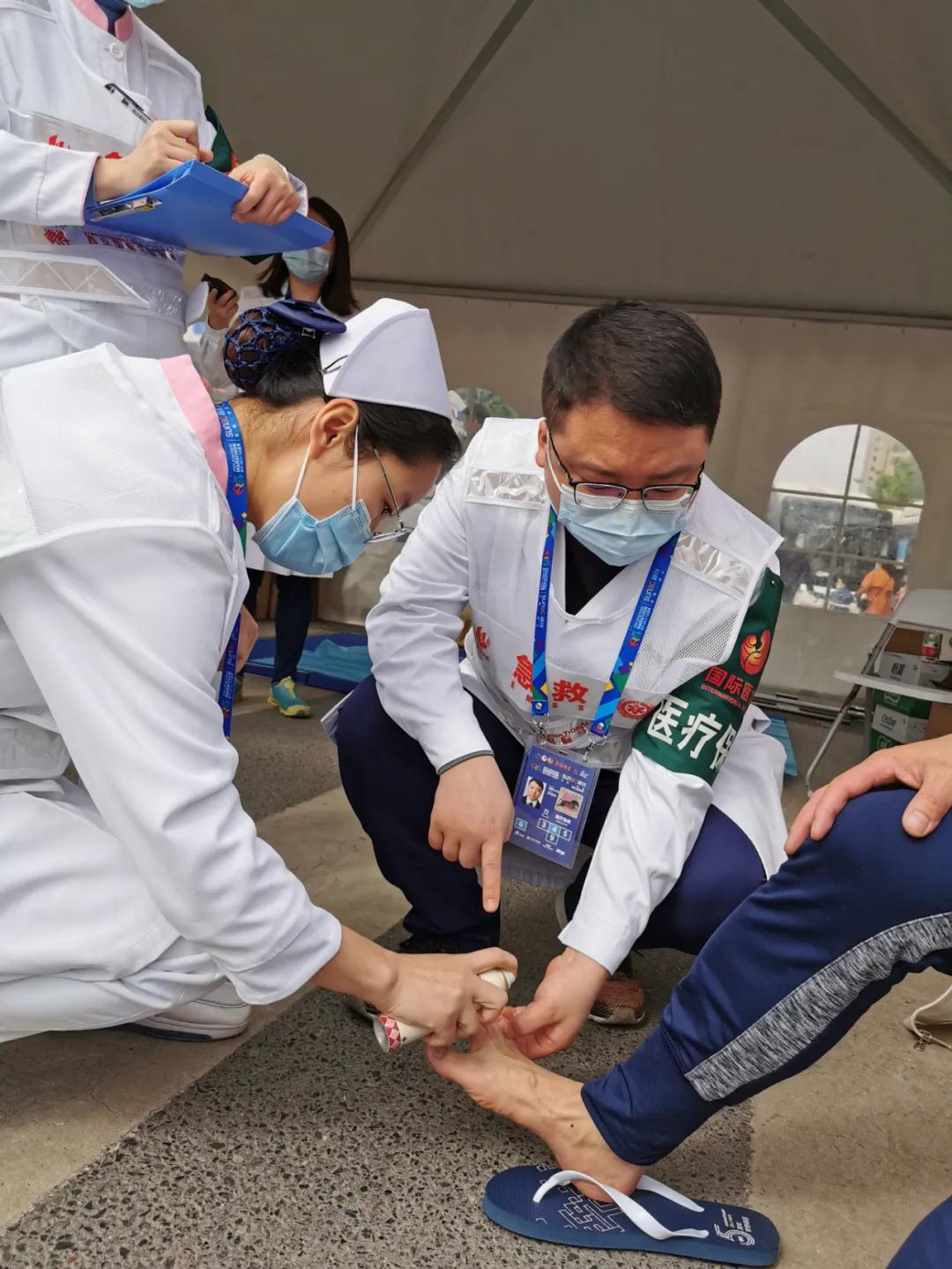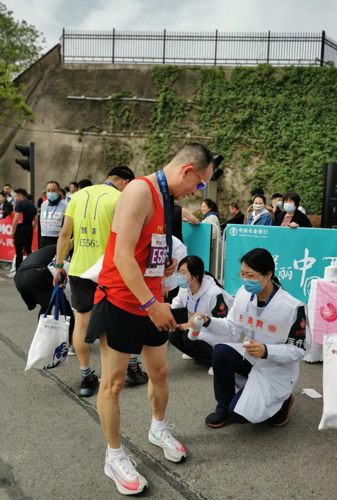 “醫(yī)生,我扭傷了腳踝,麻煩幫忙看看”,“護(hù)士,麻煩噴一些運(yùn)動(dòng)冰肌噴”……9點(diǎn)開(kāi)始,奔跑大軍陸續(xù)抵達(dá),涂抹凡士林、提供糖鹽水、處理扭傷抽筋等醫(yī)療需求均得到回應(yīng),醫(yī)護(hù)人員各司其職,對(duì)運(yùn)動(dòng)員開(kāi)展巡回指導(dǎo)和賽后恢復(fù)工作。