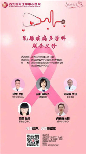 為方便患者就醫(yī),提高群眾乳腺健康意識,由西安國際醫(yī)學(xué)中心醫(yī)院腫瘤醫(yī)院、甲乳外科、放射治療中心、影像診療中心、超聲診療中心多位知名專家組成團(tuán)隊(duì),為廣大乳腺疾病患者提供全面、專業(yè)及個體化診療,并提供免費(fèi)乳腺超聲和骨密度檢查,歡迎掃碼報(bào)名。