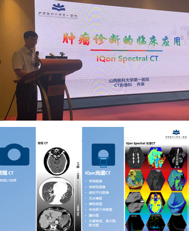 授牌儀式后即開始精彩的學(xué)術(shù)講座,首先,山西醫(yī)科大學(xué)第一醫(yī)院影像科喬英教授分享了“IQon光譜CT在腫瘤診斷的臨床應(yīng)用”。喬教授指出IQon Spectral CT的光譜重建可以提供多參數(shù)數(shù)據(jù),如單能級(jí)圖像、無水碘圖、有效原子序數(shù)值等,更加清晰的觀察病灶范圍,更加精準(zhǔn)的發(fā)現(xiàn)小病灶、進(jìn)行腫瘤分期及術(shù)后療效評(píng)估。