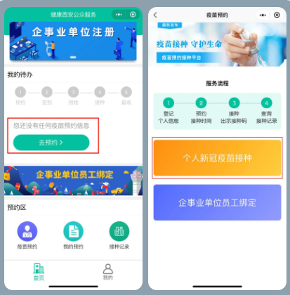 點(diǎn)擊【我的】,根據(jù)指示進(jìn)行實名制信息注冊,注冊完成后點(diǎn)擊【首頁】,選擇【去預(yù)約】,然后選擇【個人新冠疫苗接種】。