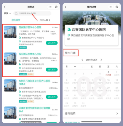 搜索框輸入“西安國際醫(yī)學(xué)中心醫(yī)院”,點(diǎn)擊【進(jìn)入預(yù)約】,選擇疫苗【可預(yù)約】日期、時間段。