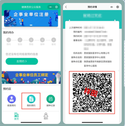 返回【首頁】,點(diǎn)擊【我的預(yù)約】,憑【二維碼】掃描來院完成疫苗接種。根據(jù)預(yù)約時間,來我院A樓一樓(藍(lán)色樓)進(jìn)行疫苗接種。
