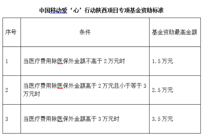 (三)項目實行“屬地醫(yī)保 慈善捐助 合作醫(yī)院減免”三結(jié)合的全額資助模式,受助患兒應在合作醫(yī)院首先進行醫(yī)保結(jié)算;醫(yī)保結(jié)算剩余部分,由中國移動愛‘心’行動專項基金按最高限價標準進行結(jié)算,其余超出治療費用由合作醫(yī)院減免,同一救助對象1年內(nèi)只給予一次救助。