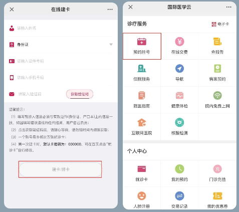 3、輸入個(gè)人信息完成就診卡綁定。綁卡后,點(diǎn)擊【預(yù)約掛號(hào)】