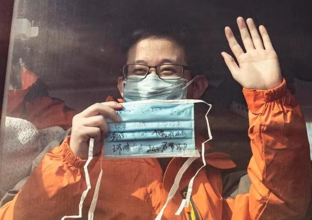 攝影作品《醫(yī)生》內(nèi)容為2020年2月3日,西安國(guó)際醫(yī)學(xué)中心醫(yī)院赴武漢醫(yī)療隊(duì)的出征現(xiàn)場(chǎng),一位即將出發(fā)的醫(yī)生展示寫(xiě)滿科室同事名字和祝福的口罩。該作品由西安報(bào)業(yè)集團(tuán)攝影記者竇翊明拍攝。