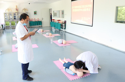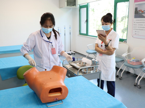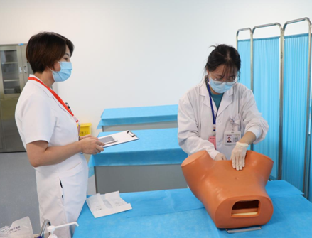 考核現(xiàn)場采用OSCE考站系統(tǒng),考生進入考場后確定考核項目,在模擬人上進行具體操作,考官根據(jù)學(xué)員操作與現(xiàn)場作答情況進行評分,整個考場井然有序。此次考核不僅檢驗了輪轉(zhuǎn)實習學(xué)員的學(xué)習效果,也達到了以考促學(xué)、以考促教的效果,促進臨床帶教水平和質(zhì)量不斷提升。