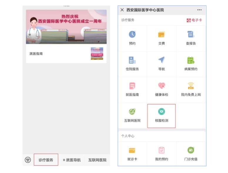 醫(yī)院核酸檢測(cè)已開通線上預(yù)約,大家可通過“西安國(guó)際醫(yī)學(xué)中心醫(yī)院服務(wù)號(hào)”微信公眾號(hào)進(jìn)行預(yù)約。