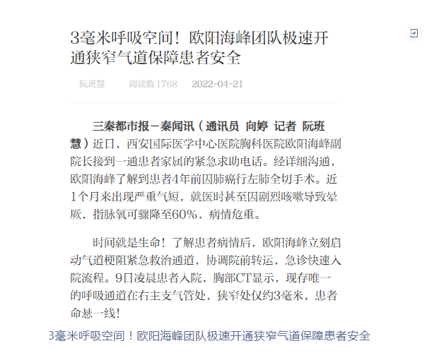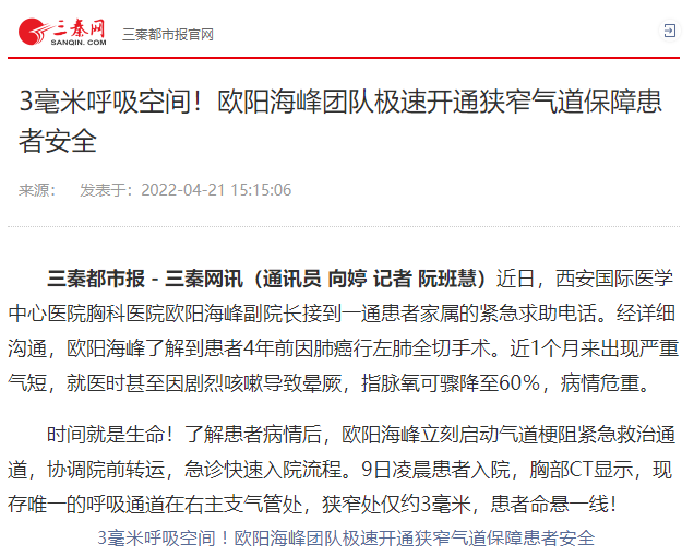 三秦都市報:3毫米呼吸空間!歐陽海峰團隊極速開通狹窄氣道保障患者安全