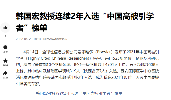 陜西老年健康報:韓國宏教授連續(xù)2年入選“中國高被引學者”榜單