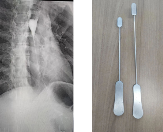 為了建立胸骨后的人工隧道,李小飛教授還自制了一把特殊的彎鉗,用于做胸骨后隧道便于將結(jié)腸順利從腹腔經(jīng)過胸骨后隧道提至頸部。