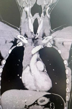 經(jīng)檢查發(fā)現(xiàn)患者前上縱隔腫瘤已經(jīng)完全侵犯了我們?nèi)梭w最主要的大靜脈之一——上腔靜脈,導(dǎo)致上腔靜脈回流嚴(yán)重受阻并導(dǎo)致由上腔靜脈起至左側(cè)無名靜脈、右側(cè)鎖骨下靜脈、右側(cè)頸內(nèi)靜脈等多根自上往下回流的靜脈阻塞,從而形成了廣泛的栓子,牢牢堵住了要流回心臟的血流,只能靠別的一些側(cè)支循環(huán)超負荷的工作,這也就是為什么孫先生脖子甚至是頭都明顯腫起來的原因。