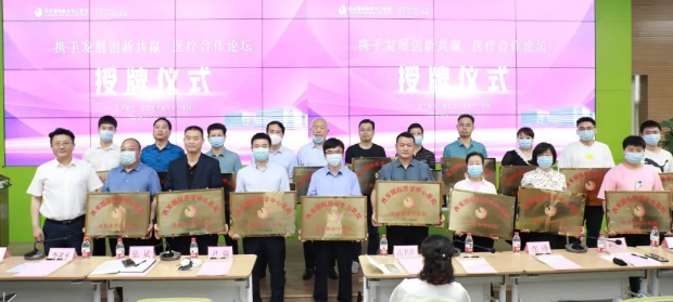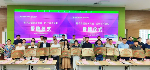 隨后尹強院長與各機構(gòu)代表完成合作簽約儀式,李武平副院長、張斌副院長為參會的各家醫(yī)療機構(gòu)授牌并合影留念。