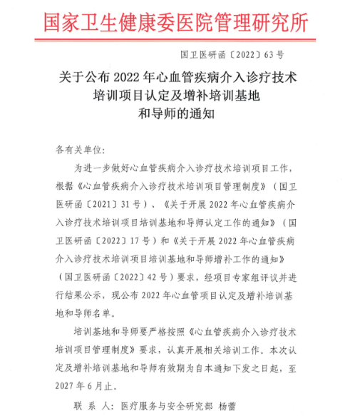 近日,國(guó)家衛(wèi)生健康委醫(yī)院管理研究所公布了2022年心血管項(xiàng)目認(rèn)定及增補(bǔ)培訓(xùn)基地和導(dǎo)師名單(《關(guān)于公布2022年心血管疾病介入診療技術(shù)培訓(xùn)項(xiàng)目認(rèn)定及增補(bǔ)培訓(xùn)基地和導(dǎo)師的通知》國(guó)衛(wèi)醫(yī)研函〔2022〕63號(hào)),繼2021年成為國(guó)家冠心病介入培訓(xùn)基地后,西安國(guó)際醫(yī)學(xué)中心醫(yī)院再獲批國(guó)家心律失常和結(jié)構(gòu)性心臟病介入培訓(xùn)基地。