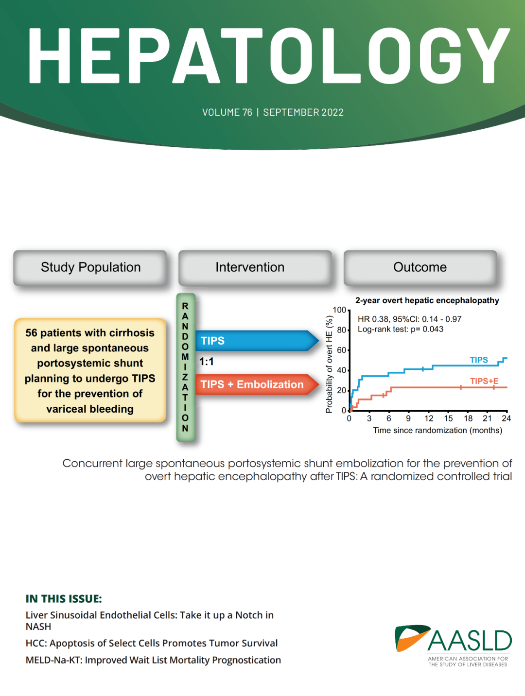 新近,西安國(guó)際醫(yī)學(xué)中心醫(yī)院消化病醫(yī)院韓國(guó)宏教授團(tuán)隊(duì)的一項(xiàng)隨機(jī)對(duì)照試驗(yàn)“經(jīng)頸靜脈肝內(nèi)門體靜脈分流術(shù)(TIPS)聯(lián)合自發(fā)性門體分流封堵預(yù)防術(shù)后顯性肝性腦病”的論著被最新一期的Hepatology雜志(IF=17.29,JCR:Q1)遴選為9月份封面文章(圖1)。該研究顯示TIPS聯(lián)合粗大分流道封堵能夠有效降低TIPS術(shù)后顯性肝性腦病的發(fā)生率,且不增加門靜脈高壓、分流道功能障礙和其他不良事件的并發(fā)癥風(fēng)險(xiǎn)[1]。