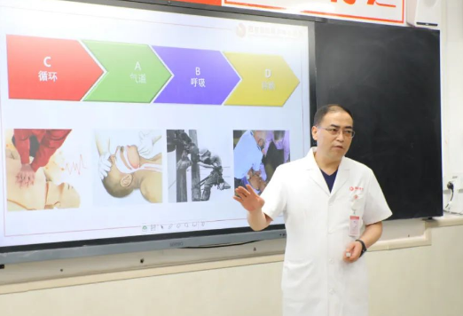西安國際醫(yī)學中心醫(yī)院麻醉手術中心副主任王彬榮以“基礎生命支持”為主題,給老師們詳細介紹了現(xiàn)場急救、復蘇的定義和基本流程,并進行現(xiàn)場演示。