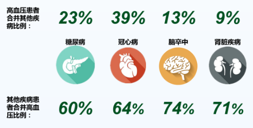 有圖有真相:在高血壓患者中,合并糖尿病的占23%,合并冠心病的占39%,合并腦卒中的占13%,合并腎臟疾病的占9%。而在糖尿病、冠心病、腦卒中、腎臟疾病患者中,合并高血壓的患者分別占了60%、64%、74%和71%。高血壓和上述4個(gè)合并癥之間呈現(xiàn)你中有我,我中有你的關(guān)系。
